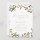 This gold greenery fall housewarming party invitation is perfect for a modern event. The design features charming artistic green and gold foliage.