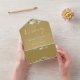 All in one wedding invitation featuring botanical greenery rustic leaves, and elegant typography on a gold background. The invitation includes a perforated RSVP card featuring a QR code. Designed by Thisisnotme©