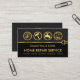 A dark grey and black layer is demarcated by a gold power plug line which can represent your electrical services. At the top are four gold construction icons. The home-wheel barrow can represent home remodeling, the brush for painting, the faucet for plumbing and the shovel-fork for landscaping, gardening etc. The black layer underneath has the business name and job title "HOME REPAIR SERVICE" alongside a list of possible services that you provide. You can change them to suit your own service needs.