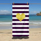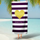 Gold Heart Name Purple Stripes Pattern Beach Towel