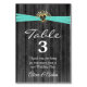 Aqua ribbon in heart with baby's breath bouquet on rustic dark gray barn wood for table number tent.
