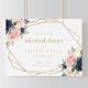 This gold horizontal rehearsal dinner welcome sign is perfect for a rustic wedding rehearsal. The design features beautiful hand-painted dark blue, blue, navy, pink, blush, gold flowers and green foliage, adorning a geometric frame.