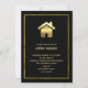 Open house invitation with a simple image of a gold gradient house on a black background.