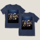 This t-shirt features a design of Jesus in starry gold script against a deep navy blue background. The text is rendered in metallic gold with a glittery, sparkly effect that gives it a luxurious, celestial appearance. The lettering has flowing curves and decorative flourishes. Around the text are several golden stars of varying sizes, each with a bright sparkly effect. The stars are above and below the text. The composition has a symmetrical layout with the text centered and the stars creating a balanced decorative pattern. The women's t-shirt features a uniquely soft tri-blend fabric, modern feminine fit, scoop neck and short sleeves. The t-shirt is a navy blue color.