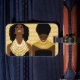 Two African Women standing side by side. One is looking down and the other is looking up. One has a short afro, the other long natural hair. They are quite modern, yet culturally stylish.