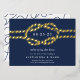 Announce your wedding to family and friends with these coastal chic save the date cards in classic navy blue and white with gold accents. Design features a golden knotted rope illustration with your wedding date in the center, with "we're tying the knot" beneath. Personalize these nautical save the date cards with your names, wedding date, location and wedding website, or an indication that a formal invitation will follow. Cards reverse to a looping nautical rope pattern in navy on white.