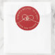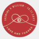 Modern minimalist double happiness knot of union, love and marriage in deep red and faux gold foil, 'love and thanks', wedding party favor sticker / envelope seal.