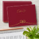 A modern and minimalist burgundy red and yellow gold circle double happiness knot of union, love and marriage on a wedding envelope with personalized return name and address.