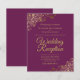 These affordable, budget friendly wedding reception invitations are the perfect choice for class, style, and beauty on a budget. Designed for guests who are invited to the reception but not the ceremony, they feature a cassis purple, magenta, or berry colored background with ornate golden faux foil lace frills in the corners. The typography includes fancy gold script lettering for a style that is at once simple and elegant. Wonderful way to invite your friends and family to share in your joy on your special day without breaking the bank.