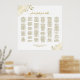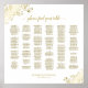 This beautiful wedding seating chart features gold text on a classic white background with seating assignments for up to 250 guests. It features a simple yet stylish and elegant design with ornate decorative faux foil golden filigree in the corners. The title is written in fancy script calligraphy and reads: Please find your table.
