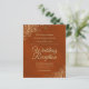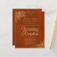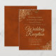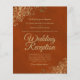 These affordable, budget friendly wedding reception invitations are the perfect choice for class, style, and beauty on a budget. Designed for guests who are invited to the reception but not the ceremony, they feature a marbled rust orange or burnt umber colored background with ornate golden faux foil lace frills in the corners. The typography includes fancy gold script lettering for a style that is at once simple and elegant. Wonderful way to invite your friends and family to share in your joy on your special day without breaking the bank.