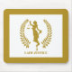 Gold faux glitter texture lady justice logo illustration featuring laurel wreath and justice scale.