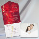 This pretty all season wedding invitation with tear away RSVP card in tones of gold and vivid red will give a sense of elegance to your wedding! The inside has a graceful gold swirl adorned with a few leaves, and there's a subtle gold confetti overlay to add a bit of sparkle. Your wedding text is in pale gold at the right of the leaf swirl image. Everything is placed on a stunning red gradient background that seems to almost glow. The bottom tear away RSVP portion has the swirl image continued, but is white to make it easy for your respondent to mark. If you don't need a text field, just blank it out, and if you need help organizing different text, please contact us. We are always happy to help. If you're having a buffet reception, we can work with you to re-design the RSVP portion, so don't hesitate to ask! An added bonus and personal touch is your own photograph on the back flap.