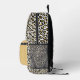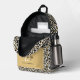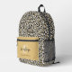 This personalized backpack features a pattern of gold and black leopard spots on a white background. Add a monogram and first name in modern black and white script to the gold pocket, with the full name below in black sans serif font. Ideal for back to school!