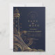 An elegant night-time coastal wedding design featuring a luminous gold lighthouse illustration set against a deep navy backdrop. Flowing ocean waves, celestial accents, and refined metallic linework create a dramatic, high-end atmosphere inspired by seaside evenings and maritime romance.