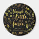 A magnet featuring the quote from William Shakespeare’s A Midsummer Night’s Dream “Though she be but little, she is fierce” surrounded by flowers and leaves in faux gold foil against a black background.