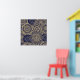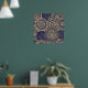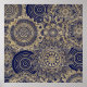 Elegant whimsical, unique faux gold glitter tribal mandalas collection design, girly henna Indian floral, filled with dots, geometric shapes, lines, stripes, triangles, circle of flowers, yellow gold, glowing dots, abstract mystic image, over a navy-blue color background. A mystical, Aztec, lux decor, navy-blue and golden illustration, image print.