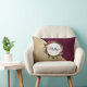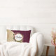 A pillow with a golden marble pattern and a solid burgundy color layered diagonally together. A circle with a faux gold foil border overlays a pretty floral bouquet with roses, carnations and other flowers. Personalize with your first or last name and monogram inside the circle.