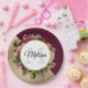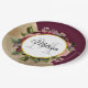 Paper plate with a golden marble pattern with a solid burgundy color layered diagonally together. A circle with a faux gold foil border overlays a pretty floral bouquet with roses, carnations and other flowers. Personalize with your name and monogram inside the circle.
