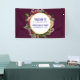 Birthday welcome banner. Designed on a dark burgundy red background. A circle with a faux gold foil border which is layered over a pretty floral bouquet with roses, carnations and other flowers. Personalize with your text inside the circle. A pair of golden wedding rings beneath your text.
