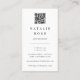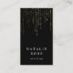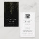 Simple and elegant vertical business card design features classic white lettering on a rich black background with cascades of faux gold foil string lights at the top. Personalize with two lines of custom text on the front, and add your full contact information to the reverse side, along with a customizable QR code.