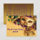Gold Mardi Gras mask with gold, green and purple beads and ribbon and text printed in purple. Back is gold with purple text.