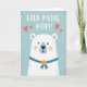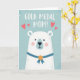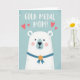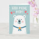 This card shows a stylized white bear-like animal centered tall in the frame, with round ears, dark shining eyes, and rosy cheeks that give it a tender, affectionate look ❤️. A bright blue ribbon is tied neatly around its neck, holding a small gold circle medal that catches the light like a prized award. The background is a cool blue-green wash with tiny scattered specks, adding a soft sense of depth behind the character. Near the top, rounded white lettering reads “GOLD MEDAL MOM!” and the words sit clearly above the character’s head. Several small red hearts float around the title, like little signals of closeness and gratitude between giver and receiver. The gentle mix of whites, blues, pinks, and reds keeps the scene sweet and friendly, with the gold accent standing out like a warm spotlight 🌼. The bear’s calm posture and slight blush suggest a caring bond, as if it’s proudly accepting praise from someone it loves. The medal hangs at mid-chest, centered on the ribbon, with the red hearts clustered near the upper text.