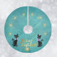 This tree skirt is teal with two black cats wearing pink bows around their necks and twinkle gold stars with gold Merry Christmas text.