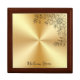 Simple luxury jewelry box, a perfect blend of elegance and personalization. Crafted from real wood and ceramic top with a gold metallic printed design, this jewelry box is designed to be both a beautiful display piece and a functional storage solution. The top of the box features a stunning circular gold brush design and a cute hand drawn floral corner border, adding a touch of sophistication and sparkle to the overall aesthetic. To make this jewelry box truly yours, it is personalized with your name, elegantly printed on the bottom. This thoughtful customization transforms the box into a unique keepsake, perfect for storing your most treasured jewelry pieces. With its timeless design and personal touch, this mahogany jewelry box is not only a wonderful addition to your own collection but also a cherished gift for someone special.