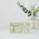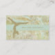This is a really pretty business card for a gymnastics instructor or gym. It features a gold, mint green, and white abstract marbled background, with a matching light green name banner. The banner is thinly lined in shiny gold. Your custom text is in gold, also. A darker gold gymnast strikes a pose on the left side of the front. The back of the card has the same background, with a field for your information in gray. Striking!