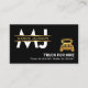 An all black cover is accentuated by a placard with faux gold borders near the top of the card. This placard houses your prestigious name. Behind this are two white monogram letters to represent your name. Towards the right side of the card is a faux gold semi truck logo you can use alongside the slogan "truck for hire". Please change the caption remarks to suit your service needs. Contact details can be found just below the slogan.