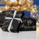 This stylish wrapping paper features a musical theme. Gold sheet music notes are whimsically placed across a black background. It's a perfect for wrapping a gift for the musician in your life.