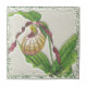 This decorative ceramic tile features a gorgeous darj reddish lady slipper flower, facing to one side, in the style of vntage botanical illustrations. The lady slipper orchid flower often appears in small openings, grassy meadows, woodsy knolls, and prairies, and it's a protected plant in some states. The tile has a faux 3D texture - it's printed flat although it appears to have dimensions to the surface.