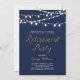 Celebrate a special day with this stylish gold party invitation! This design features a stylish script typography with a gold glitter texture and light string on a navy blue background. You can customize the background color.