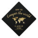 Gold world map and “off to conquer the world” quote on a tassel topper graduation cap decoration that can be personalized with the graduate's name and class year. Click ‘customize further’ to change the background and text colors to match your school colors or change the quote.
