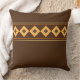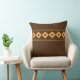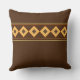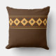 A border of gold, orange and brown geometric diamond shapes adds interest to the top third of this throw pillow. The diamond images are contained within a double line frame. Everything is placed on a matching chocolate brown background. The back of the pillow has the same design.