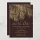 Modern gold palm tree elegant save the date. Modern simple faux gold palm tree with simple typography, a trendy and tropical save the date wedding theme on palm tree leaf with editable red burgundy.