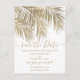 Modern gold palm tree elegant save the date. Modern simple faux gold palm tree with simple typography, a trendy and tropical save the date wedding theme on palm tree leaf.