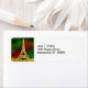 Customizable Invitations and accessories with a Parisian theme featuring a stylized golden colored Eiffel Tower against a festive Christmas Red and Green star filled sky