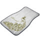 Create a unique floor mat for your vehicle with a set of Gold Peacock Personalized Car Mats. Car mat is a visually striking automotive accessory, featuring a vibrant metallic blue peacock with iridescent feathers shimmer with hues of golden tones, creating a bold and luxurious focal point. Set against a gray grunge background, adorning the design are delicate white leaf botanicals, intricately woven around the peacock. These leaves add a touch of elegance and nature-inspired softness, softening the grunge background’s roughness while complementing the peacock’s regal presence. Elegant script lets you add your name or recipients name for a personal gift.