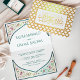Invite your guests with this beautiful folded wedding invitation featuring an intricate floral art and Arabian style arch design on the inside and real gold foil Moroccan quatrefoil pattern with 'Bismillah' in Arabic calligraphy on the outside. Simply add your event details on this easy-to-use template to make it a one-of-a-kind invitation.