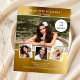 Create your own unique photo collage. Use four, 4 of your favorite photos. Personalize and add a name and party details. Faux gold looking background, white text.