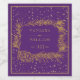 Gold pine frame with cones, confetti and border purple winter Christmas wedding wine label. A lovely wedding design that includes a gold pine frame with cone and needles and gold confetti borders on purple background.