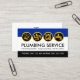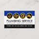 A blue, white and black cover is accentuated by a shiny gold plumbing tools icon design at the top of the card. Near the card's center is the business name "PLUMBING SERVICE" alongside a list of possible services which you can change. The black stripe at the base houses your phone contact details.