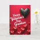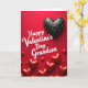 This greeting card features a deep ruby-red background filled with tiny gold starbursts and small sparkly flecks. In the center, the words “Happy Valentine’s Day Grandson” are written in white, flowing cursive-style lettering that stands out clearly against the red. In the upper right, there’s a large black heart covered in neat gold polka dots, giving it a special, eye-catching look. Across the lower half, many red hearts tumble downward in different sizes, some with a soft shimmer and others with a glossy shine. The mix of shiny and softer textures makes the hearts feel layered and full of warmth. It feels meaningful to give because it’s direct about who it’s for, and the hearts and gold details add a gentle feeling of love and care ❤️.