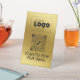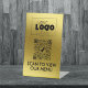 set on a pedestal-style freestanding tabletop sign, this style offers an antique gold simulated metallic background, two designated spaces for graphics, and a textbox at the bottom offering a simple, modern / contemporary sans serif typeface in black. personalize this message to say whatever you would like.