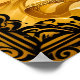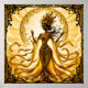 "A mesmerizing Wayang Kulit shadow puppet scene featuring a dramatic and beautiful goddess, intricately designed with traditional Javanese and Balinese motifs. Her elegant silhouette is adorned with delicate carvings and elaborate golden patterns, reflecting the artistry of classic shadow play. The goddess exudes divine grace, with flowing garments and ornate jewelry shimmering in hues of light yellow and bright liquid gold. The background glows with a soft golden radiance, enhancing the mystical ambiance of the scene. The entire composition is framed by an elegant, ornamental border with fine, swirling details, reminiscent of ancient temple carvings. Subtle lighting effects add depth and contrast, emphasizing the intricate craftsmanship and storytelling essence of Wayang Kulit art."