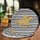 Party paper plates - in 2 sizes - feature a race horse in faux gold glitter on black and white stripes. You can change the color from white to any color with the color picker tool. Derby party, Derby bridal shower, birthday party and more. MATCHING items in our store ---> http://bit.ly/2U3Sokd <---
