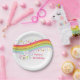 These cute birthday paper plates feature a colorful rainbow with faux gold glitter accents.