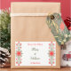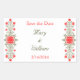 A custom Save the Date sticker with a vintage printers mark etching of a decorated shield and a a floral design of daisies and curling leaves in red and golds, restored from an antique manuscript.